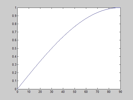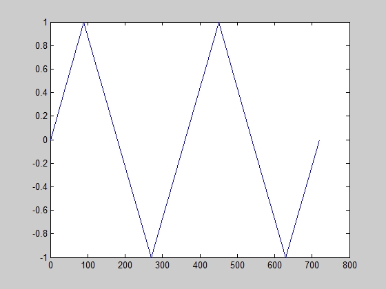 plot(x, sind(x));আমরা এই গ্রাফের জন্য স্টেপ ৯০ কে একক হিসেবে নিয়েছি। যেহেতু ৯০*৪ = ৩৬০ তাই একটি সাইকেলের গ্রাফ আঁকতে আমার নেওয়া স্থানাংকের পরিমাণ ৪! এখন প্রতি ৯০ ডিগ্রি পর পর না করে এক কাজ করা যাক, প্রতি ডিগ্রি কে একক ধরে আমরা গ্রাফটি আবার আঁকি।
