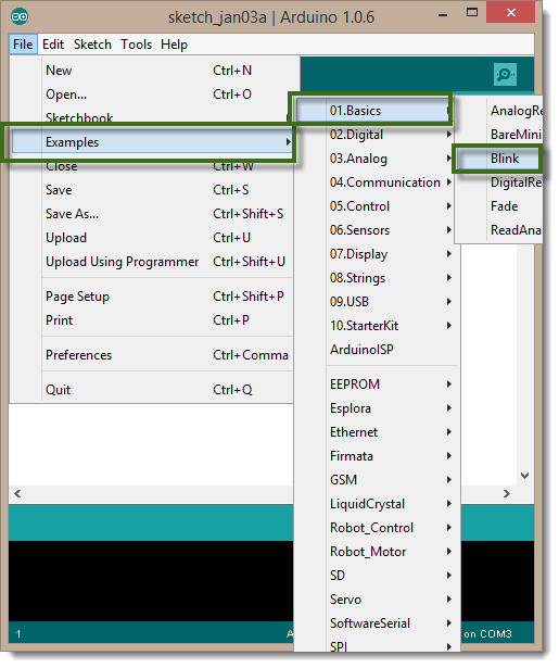 Example এর জন্য File > Examples > Basics > Blink এ ক্লিক করুন, নতুন উইন্ডো ওপেন হবে: