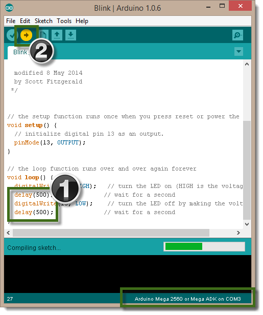 Arduino তে আগে থেকেই Blink প্রোগ্রামটি বার্ন করা থাকে, তাই আমার পরামর্শ হল Blink প্রোগ্রামটি বার্ন করার আগে delay এর মধ্যে 1000 এর বদলে আপনি অন্য কোন সংখ্যা বসান, যেমন delay(100) বা delay(50) যাতে আমরা নতুন প্রোগ্রাম আর পুরনোটার মধ্যে তফাত খুঁজে পাই।