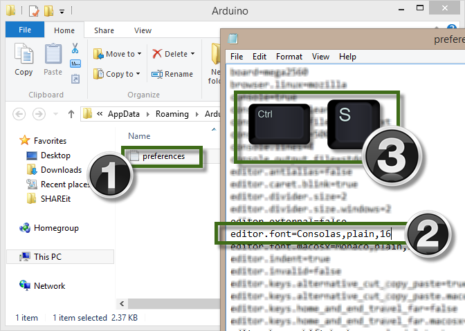 নতুন ফোল্ডার আসবে একটি টেক্সট ফাইল দেখতে পাবেন preferences.txt নামে, সেটা ওপেন করুন, editor.font খুঁজে বের করে Monospaced এর জায়গায় আপনার পছন্দের ফন্টের নাম লিখুন [আমি এখানে উইন্ডোজের সবচেয়ে ভাল Monospaced font হিসেবে Consolas ব্যবহার করেছি], plain কে পরিবর্তন না করে পাশে যে সংখ্যা আছে সেটা পরিবর্তন করুন। সংখ্যাটি ফন্টের সাইজ নির্দেশ করে।
