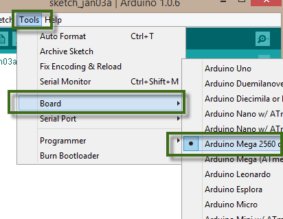 আবার Tools > Board > Arduino …. [এখানে আপনার বোর্ডটি সিলেক্ট করবেন, আপনার বোর্ড UNO হলে সবার প্রথমটা আর Mega হলে ছবিতে যেটা দেখানো হয়েছে সেটা সিলেক্ট করলেই হবে]